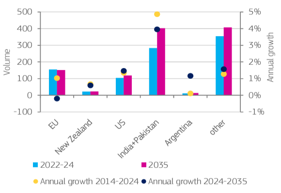 Produkcja w USA, która zmaga się z mniej rygorystycznymi ograniczeniami polityki ochrony środowiska, może zwiększyć swój udział w światowym eksporcie (20% udziału w światowym eksporcie w 2035 r. w porównaniu z 15% w latach 2022-2024). Argentyna prawdopodobnie wzmocni swoją pozycję jako ważny eksporter w Ameryce Południowej.