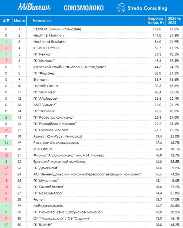 Firmy z kategorii lodów (Renna, Iceberry, Unirus, Froneri) oraz produktów mlecznych również odnotowały stabilny wzrost na tle rosnącego spożycia serów i masła. Jugowskaja Mleczarska Fabryka, Foodland, Wamin i Rovenki-Maslosyrzavod znacząco zwiększyły swoje przychody. Jednak najwyższe wskaźniki wzrostu – ponad 30% rocznie – wykazali liderzy w kategorii mleka pełnego: grupa firm Ruslakto, Lebedyanmoloko, Zakład Mleczarski w Briańsku, EkoNiva i Rostagrokompleks. Łączne przychody 30 największych firm mleczarskich na koniec 2024 r. wyniosły około 1,02 biliona rubli (11,19 mld euro) – preztyp. Forum Mleczarskie), czyli około 50% rynku mleczarskiego, zapewniając przetwórstwo ponad 60% mleka produkowanego w kraju – to ponad 20 mln ton.