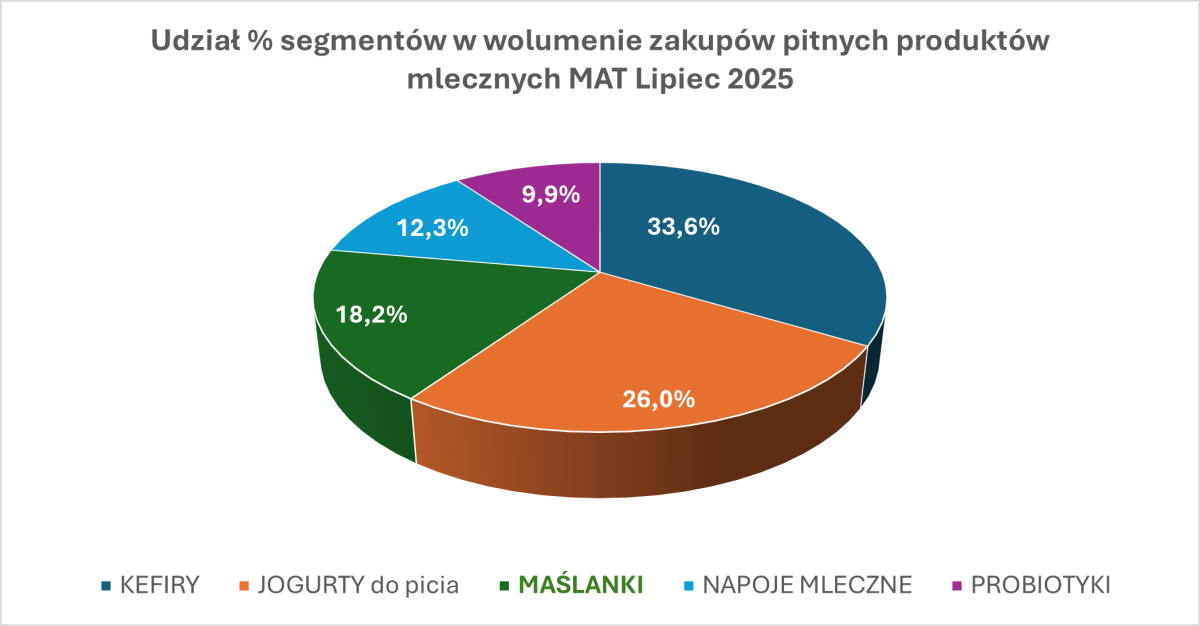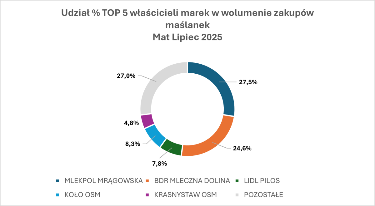 – W kategorii maślanek przeważają produkty markowe nad produktami marek własnych detalistów. Marki producenckie stanowią ok. 64% wolumenu zakupów całej kategorii dokonanych przez gospodarstwa domowe w Polsce w okresie dwunastu miesięcy do lipca 2025. Głównymi graczami (właścicielami marek) w kategorii maślanki są Mlekpol (SM) i marka Mrągowska, Koło (OSM) i Krasnystaw (OSM) w produktach markowych oraz Biedronka i Lidl w produktach marek własnych. Lider kategorii Mrągowska firmy Mlekpol (SM) odpowiada za 27% rynku w ujęciu wolumenowym. TOP 5 właścicieli marek stanowi łącznie 73% wolumenu zakupów kategorii maślanek dokonywanych przez Polaków.