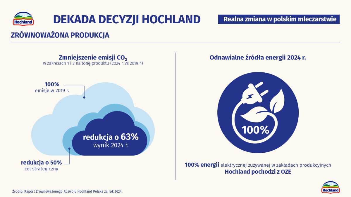 Jednym z kluczowych celów środowiskowych Hochland Polska było ograniczenie emisji CO₂e o 50% do 2025 r. Ostatecznie wynik okazał się znacznie lepszy – osiągnięto 63% redukcji emisji gazów cieplarnianych w zakresach 1 i 2 na tonę produktu względem roku bazowego 2019. Firma podkreśla, że świadomie zrezygnowała z komercyjnych certyfikatów węglowych (tzw. projektów offsetowych), koncentrując się wyłącznie na realnych redukcjach emisji związanych z działalnością obu zakładów.