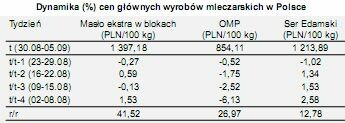 Na krajowym rynku mleka od sierpnia br. przeważają spadkowe tendencje cen zbytu stałych przetworów mleczarskich. Na początku bieżącego miesiąca potaniało zarówno masło jak i odtłuszczone mleko w proszku, a także cześć serów dojrzewających.