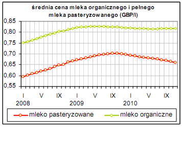 Wyniki badań, zrealizowanych przez ośrodek badawczy Kantar wykazują, że w czerwcu 2010 roku przeciętna cena sprzedaży mleka organicznego w Wielkiej Brytanii wynosiła 0,81 GBP/l (w przeliczeniu ok. 0,99 EUR/l), była ona o 20% wyższa niż cena za pasteryzowane mleko, która kształtowała się na poziomie 0,67 GBP/l (ok. 0,82 EUR/l). W ciągu czterech tygodni, zakończonych dniem 3.10.2010 cena organicznego mleka wzrosła do 0,816 GBP za litr. i jest o 33,7% wyższa niż cena pasteryzowanego, która w tym okresie spadła do 0,61 GBP/l (ok. 0,77 EUR/l) . Gdy weźmiemy pod uwagę promocje supermarketowe, standardowe mleko sprzedawane jest za ok. 0,44 GBP/l. Organiczne mleko natomiast wyceniane jest na 0,76 GBP/l. Dane Kantar dla 52 tygodni zakończonych 3 października 2010 roku ukazują, że wolumen sprzedaży mleka organicznego spadł o 4,1 mln litrów (o 2,5% w porównaniu do tego samego okresu z 2009 roku).