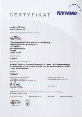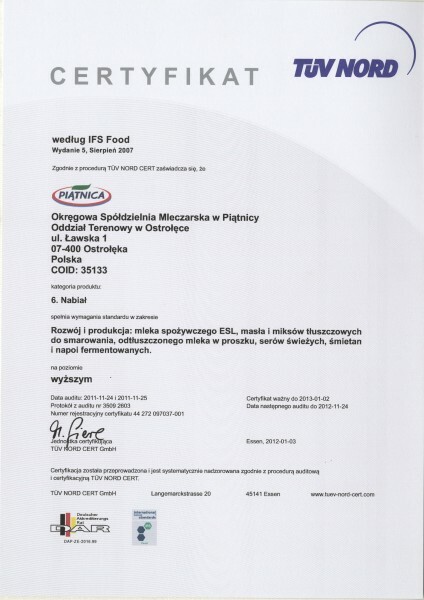 Oddział Terenowy w Ostrołęce to kolejna po zakładzie w Piątnicy placówka firmy, która uzyskała certyfikat poświadczający spełnianie standardów IFS na poziomie wyższym. Zakład w Piątnicy otrzymał certyfikat IFS w 2010 roku. Certyfikat poświadcza wysoką jakość w zakresie rozwoju i produkcji: serka wiejskiego, serów świeżych, serków śmietankowych, śmietan oraz napojów fermentowanych. Certyfikacja została przeprowadzona zgodnie z procedurą audytową i certyfikacyjną TUV NORD CERT.