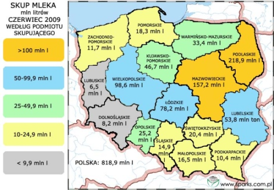Według GUS średnia cena skupu mleka wg województw w Polsce w czerwcu 2009 wyniosła 90,65 zł/100 l z VAT (86,40 bez VAT) i była 0,5% mniejsza w porównaniu do maja br. i około 25% mniejsza niż w czerwcu 2008 r.