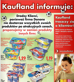 Produkty koncernu Danone zostały usunięte z półek sklepowych sieci Kaufland. Powodem jest niemożność porozumienia co do cen zakupu produktów Danone - tak wynika z doniesień gazeta.pl i gazetki Kauflanda. Według informacji samej sieci handlowej, Kaufland ma w Polsce ponad 150 placówek handlowych.