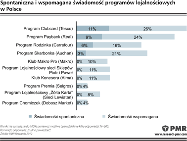 Jak wynika z badań, Polacy cechują się bardzo niską znajomością spontaniczną, jak i wspomaganą programów lojalnościowych oferowanych przez super- i hipermarkety. Jedynie 11% respondentów zna na poziomie spontanicznym program Clubcard w Tesco, niecałe 9% wskazuje na program Payback oferowany w sieci Real, niemal 6% przychodzi do głowy program Rodzinka (Carrefour), a 3% – program Skarbonka, który jest dostępny w Auchan. Pozostałych sześć programów dostępnych w sieciach handlowych w Polsce w ogóle nie jest wymienianych przez ankietowanych przy badaniu znajomości spontanicznej. Wśród respondentów 13% potrafi wymienić jedynie nazwy sklepów, w których są programy lojalnościowe, natomiast nie zna konkretnych nazw tych programów.