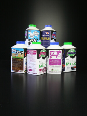 Cztery organizacje charytatywne będą wspierane we wrześniu dzięki mleczarni Robert Wiseman Dairies. Na 4 mln opakowań 500 ml i 1 l do świeżego mleka znajdą się informacje o pracy organizacji charytatywnych tj. Send a Cow, Crimestoppers, RNLI i CLIC Sargent.