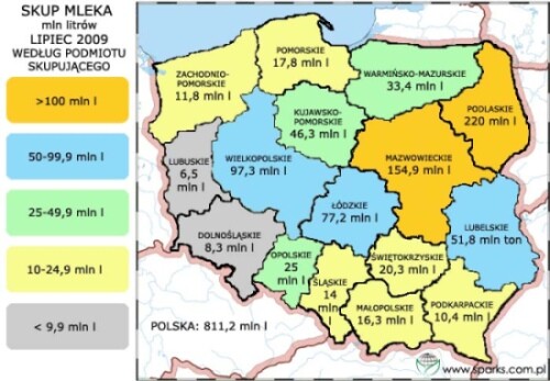 Według GUS średnia cena skupu mleka wg województw w Polsce w lipcu 2009 wyniosła 90,13 zł/100 l z VAT (85,77 bez VAT) i była 0,6% mniejsza w porównaniu do czerwca br. i około 12% mniejsza niż w lipcu 2008 r.