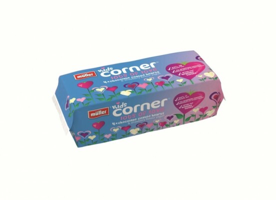 Produkty dla dzieci Müller Kids Corner dostępne są w wersji Football (Vanilla z biało-czarną czekoladą i płatkami w kształcie piłek), Lots of Love (Truskawka z różową i białą czekoladą) oraz Choccy Raisins (Toffee).