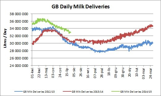 Produkcja mleka i dostawy do mleczarni w Wielkiej Brytanii rośnie od lipca 2013 roku. Statystyki łączne dla Anglii, Walii i Szkocji pokazują wzrost produkcji. Po dołku produkcyjnym w październiku 2012 roku, produkcja mimo wahań sezonowych wiosną 2013 roku już tylko rosła.