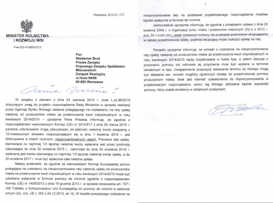 Jak widnieje w tekście listu od Wiceministra K. Plocke do Prezesa Zarządu Waldemara Brosia, udostępnionym przez Krajowy Związek Spółdzielni Mleczarskich Zw. Rew. rozłożenei płatności na raty jest możliwe w zakresie każdego kraju członkowiego Wspólnoty w terminach do 20.09.2015 (I rata w wysokości 1/3), 20.09.2016 (II rata w wysokości 1/3) i do 20.09.2017 (III rata). Zgodnie ze stanowiskiem Komisji pomoc może być realizowana wyłącznie w formule de minimis i dla podmiotów, które z niej jeszcze nie korzystały.