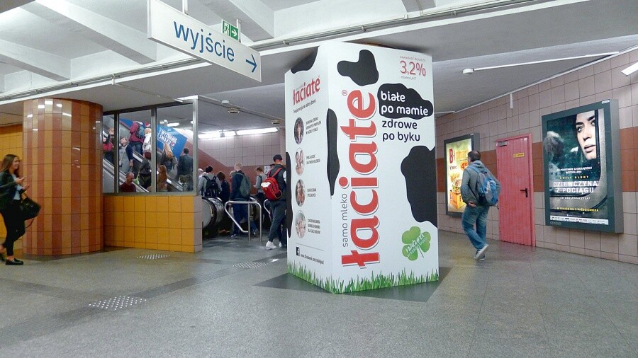 W sobotę, 1 października rozpoczęliśmy miesięczną kampanię uzupełniająca tę telewizyjną, internetową i bilboardową. Na stacji Metro Centrum stanęły słupy w postaci kartonów mleka Łaciate 3,2 %. To chyba rzeczywiście największe kartony świata – mają prawie 3 metry wysokości. Ale to nie koniec. Od 10 października Łaciate wyjdzie do ludzi i będzie tak wychodzić do 4 listopada.