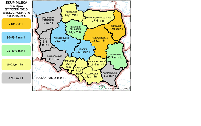 Według GUS średnia cena skupu mleka w Polsce, w styczniu 2010 wyniosła 107,48 zł/100 l z VAT (102,22 bez VAT) i była 2,4% mniejsza w porównaniu do grudnia 2009 r. i 16,3% większa niż w styczniu 2009 r. Najniższa cenę za 100 litrów bez VAT odnotowano w woj. podkarpackim - 86,72 zł (91,15 z VAT), małopolskim - 92,68 zł (97,86 z VAT), woj. śląskim - 93,37 zł (97,87 z VAT) i świętokrzyskim - 93,97zł (97,74 z VAT). Najwyższą w woj. podlaskim 113,01 zł (119,35 z VAT), woj. dolnośląskim - 103,61 zł (107,67 z VAT), woj. zachodniopomorskim - 102,36 zł (107,28 z VAT), woj. lubuskim - 100,87 zł (104,40 z VAT), woj. opolskim - 100,46 zł (104,71 z VAT) i w woj. pomorskim - 100,12 zł (104,81 z VAT). W styczniu skupiono 680,2 mln l mleka, to jest 1,4% (9,5 mln l) więcej niż w grudniu 2009 r. oraz 2,4% (16,8 mln l) więcej w stosunku do stycznia 2009 r.