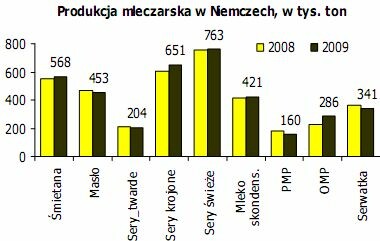 Produkcja artykułów mleczarskich również wykazywała na ogół tendencje wzrostowe – dane dla najważniejszych typów nabiału w Niemczech (za 2009 rok) przedstawia wykres. Pod względem ilościowym dominującym artykułem było mleko spożywcze, którego produkcja wzrosła o 3,3% do blisko 5,3 mln ton, zaś śmietany było w 2009 roku o 2,6% więcej niż rok wcześniej. Wytworzono rekordową ilość blisko 2,09 mln ton serów (nie uwzględniając serów topionych, których wolumen pozostał stabilny – ok.181 tys. ton), co oznaczało ponad 3% zwyżkę w stosunku do 2008 r. Wśród nich najważniejsze były sery świeże (+1,1%) i krojone, których ilość wydatnie wzrosła (+7,6%) i również osiągnęła rekordowy poziom.