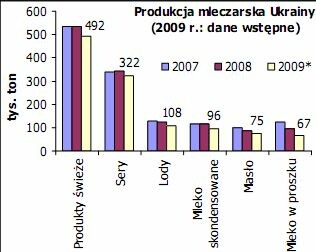 Produkcja masła zmalała o 12%, lodów o 14%, a mleka skondensowanego o 18%. Zniżki nie ominęły segmentów artykułów trafiających w dużej mierze na eksport, szczególnie mleka w proszku (P30%), a w mniejszym stopniu serów (P6%): 1/3 tych wyrobów jest z powodu wyższych cen sprzedawana za granicę, głównie do Rosji. Szacunkowe dane za 2009 r. przedstawia wykres.