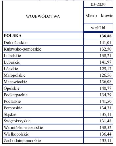 Według Głównego Urzędu Statystycznego cena skupu mleka w marcu 2020 r. wyniosła 136,86 zł/1 hl i była niższa o 0,7% niż w marcu 2019 r. Cena skupu mleka w odniesieniu do lutego 2020 r. była o 0,4% niższa.