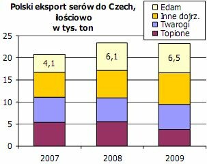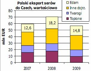Do tego pozytywnego zjawiska doszło przy równoczesnym spadku dostaw i przetwórstwa mleka – czeskie mleczarnie skupiły w 2009 roku 2,29 mld. litrów surowca, o 3,3% mniej niż rok wcześniej. Wskutek tego zmalała produkcja masła, serów i twarogów, a nieznacznie wzrosła ilość wytworzonego mleka spożywczego i artykułów o wyższej wartości dodanej, w tym jogurtów i deserów mlecznych. Coraz większą popularnością zaczyna się cieszyć sprzedaż mleka bezpośrednio od (bardzo nielicznych w Czechach) producentów, a także np. z automatów. Pierwsze takie urządzenia pojawiły się jesienią ub. roku, a obecnie jest ich już ponad 160. Konieczny stał się zatem wzmożony import, który zaspokaja obecnie aż 40% krajowego zapotrzebowania na nabiał. Np. na czele najpopularniejszych serów z zagranicy znalazł się Edam. Sprowadzono go w ub. roku 24 tys. ton, głownie z Niemiec i Polski. Potwierdzają to polskie dane handlowe, opracowane przez FAMMU/FAPA. Eksport sera edamskiego do Czech stanowił w latach 2008-09 około 26-28% wartości i ilości wywozu serów w tym kierunku.