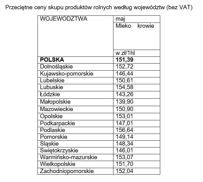 Według Głównego Urzędu Statystycznego cena skupu mleka w maju 2021 r. wyniosła 151,39 zł/1 hl i była wyższa o 15,7% niż w maju 2020 r. Cena skupu mleka w odniesieniu do kwietnia 2021 r. była o 0,6% niższa.