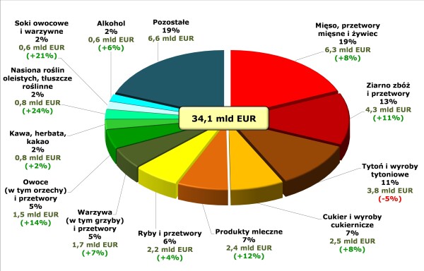 W okresie od stycznia do listopada 2021 r. wartość eksportu ogółem towarów rolno-spożywczych z Polski, w porównaniu z tym samym okresem 2020 r., wzrosła o 8,2%, do 34,1 mld euro, tj. 155,3 mld zł. Około 73% wpływów z eksportu produktów rolno-spożywczych uzyskano ze sprzedaży do krajów UE. Na rynku unijnym sprzedano towary o wartości 24,7 mld euro, co oznaczało wzrost o 10% w stosunku do analogicznego okresu 2020 r.