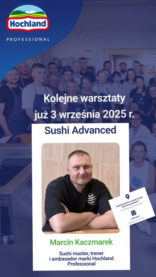 Głównym prowadzącym wrześniowe warsztaty „Sushi Fusion” będzie Marcin Kaczmarek – sushi master, trener i ambasador marki Hochland Professional. Od prawie 15 lat doskonali swoje umiejętności w sztuce sushi, a od niemal dekady prowadzi dwie restauracje Yattai Sushi Bar w Poznaniu. Jego kuchnia łączy precyzję japońskiej tradycji z nowoczesnym podejściem, oferując sushi w stylu europejskim z dbałością o jakość, składniki i detale. Marcin Kaczmarek zdobył certyfikat AJSA (All Japan Sushi Association) oraz szkolił się u Mistrza Świata Sushi, Alona Than. Jego talent został doceniony już w 2018 r. przez magazyn „Sukces po Poznańsku”, a rok później znalazł się w gronie laureatów Poland Sushi Cup, prestiżowego konkursu dla profesjonalnych Sushi Masterów. Brał również udział w World Sushi Cup w Japonii, gdzie zdobył certyfikat Kuro Obi na poziomie 2 KYU.