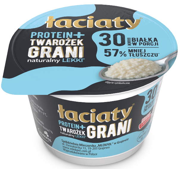 Śniadanie, które daje siłę na cały dzień? Przekąska po treningu, która naprawdę regeneruje? Spółdzielnia Mleczarska Mlekpol odpowiada na potrzeby współczesnych konsumentów, wprowadzając na rynek twarożek grani lekki Łaciaty Protein+. Jedna porcja tego produktu to aż 30 gramów pełnowartościowego białka. Dodatkowo zawiera on o 57% tłuszczu mniej niż standardowy wariant (o zawartości tłuszczu 7%), zachowując jednak charakterystyczną kremowość i świeży smak.