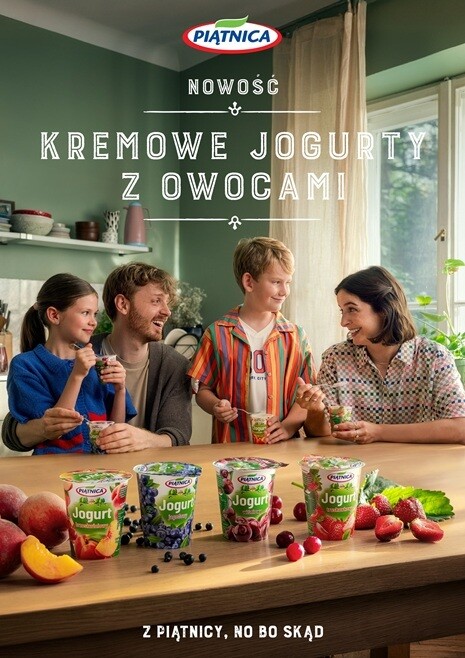 Piątnica z kampanią reklamową jogurtów z owocami. Rodzinny spot TV i jogurty w apetycznym wydaniu