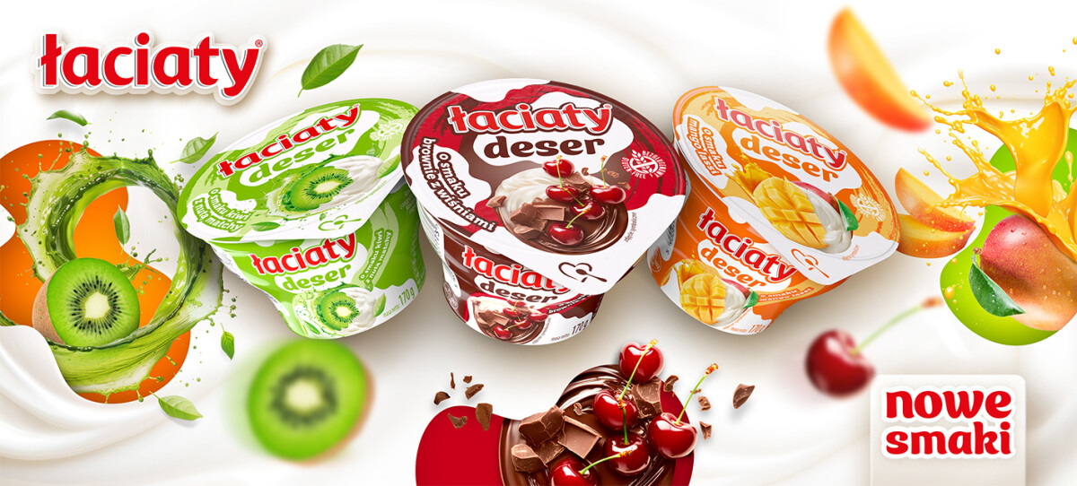 Desery Łaciate dostępne są w wygodnej porcji 170 g. Poza nowościami na sklepowych półkach znajdziemy także dobrze znane konsumentom smaki: muffinka jagodowa, tarta cytrynowa, z nata de coco i kawałkami czekolady oraz z truskawkami i śmietanką.