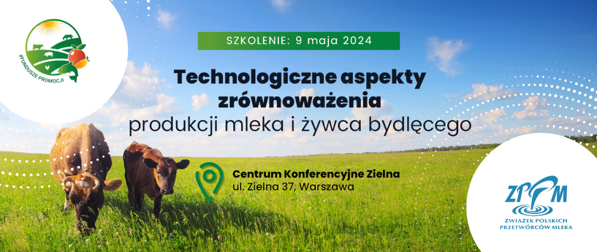 Najbliższe szkolenie odbędzie się w godzinach 11:00 – 13:30, w dniu 9 maja 2024r., w Centrum Konferencyjnym „Zielna” przy ul. Zielnej 37 w Warszawie. Szczegółowy program, jak też formularz zgłoszeniowy dostępny jest na stronie internetowej organizatora: https://www.portalmleczarski.pl/2024/04/18/szkolenie-zppm-pt-technologiczne-aspekty-zrownowazenia-produkcji-mleka-i-zywca-bydlecego/