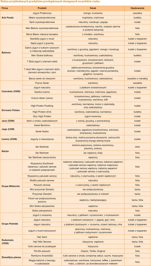 Ciekawie rozwijającą się kategorią są przekąski dla mężczyzn. Nie jest to już tylko ser do piwa, ale ciekawie skomponowana mieszanka produktów mleczarskich wzbogaconych w elementy wysokoproteinowe. Do kategorii tej należą m.in. wszelkiego typu batony, szejki i serki. W kategorii tej specjalizują się Bakoma (Men Batony wysokobiałkowe oraz szejk białkowy), Arla Foods (szejki Cocio Caramel&Biscuits, czekoladowy, malinowy z białą czekoladą, serki Apetina) oraz Ehrmann Polska (puddingi, napoje, skyr). Tego typu przekąski pakowane są najczęściej w opakowania wygodne tj. butelki, saszetki czy batony. Zarówno butelki jak i saszetki pozwalają na wpisanie ich w trend opakowań „on the go” co umożliwia podobnie jak butelkę zabranie ich ze sobą na siłownię, jogging lub trzymanie w biurowej lodówce.