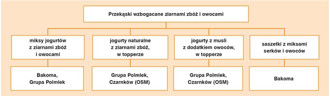 Systematycznie rozwijaną kategorią są wszelkiego typu produkty z dodatkiem zbóż. Przykładem są produkty: Bakoma (7 zbóż Men, Start and Go), Grupy Polmlek (jogurt z owsianką lub jogurt z musli), mleczarni Czarnków OSM (jogurt z płatkami śniadaniowymi, w opakowaniu z topperem). W portfolio Bakoma znajdziemy m.in. linię 7 zbóż dedykowaną kobietom oraz 7 zbóż Men przeznaczoną dla mężczyzn i wychodzącą naprzeciw ich potrzebom żywieniowym. Linia kobieca to wersja produktów na bazie jogurtu, mieszanki zbóż oraz owoców. Linia dla Mężczyzn wzbogacona jest dodatkowo ziarnami słonecznika i dyni.