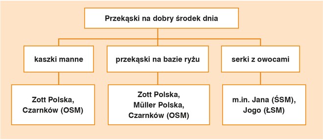 W kategorii kaszek mannych na krajowych półkach znajdujemy m.in. kaszki manne pod marką Smakija firmy Zott Polska oraz produkty mleczarni Czarnków (OSM). W kategorii producentów przekąsek ryżowych należy wymienić firmy: Müller Polska (przekąski Riso standardowe oraz z dodatkiem 5 ziaren), Zott Polska (linia Belriso) oraz produkty Czarnków (OSM) tj. desery ryżowe Czaruś z owocami.