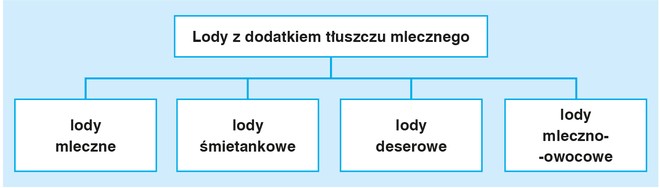 Lody zawierające tłuszcz mleczny dzielą się na: mleczne, śmietankowe, deserowe oraz mleczno-owocowe. Lody mleczne to produkty o zawartości tłuszczu nie mniejszej niż 2,5% i których podstawowym składnikiem jest mleko; mogą być z dodatkami lub bez. Lody śmietankowe to produkty o zawartości tłuszczu nie mniejszej niż 8,5%, których podstawowymi składnikami są: śmietanka i mleko. Lody deserowe (tzw. cassate, torty lodowe, plombiry) to odmiana lodów śmietankowych o zawartości tłuszczu nie mniej niż 14,5% różnią się od innych tym, że są 2-krotnie zamrażane – raz w maszynie a drugi raz w formach metalowych. Lody mleczno-owocowe to produkty o zawartości tłuszczu 2,5%, w których podstawowymi składnikami oprócz mleka i śmietanki są owoce i dodatki.