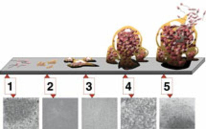 Jak powstaje biofilm? Na czystą sterylnie powierzchnię opada odrobina pary wodnej wraz z niewielką ilością składników odżywczych i po upływie kilku minut, godzin lub dni mikroorganizmy zaczynają organizować specyficzny ekosystem luźno powiązanych komórek zanurzonych w polisacharydowym śluzie produkowanym przez drobnoustroje kolonizujące, a służącym do ochrony mieszkańców siedliska oraz komunikacji na poziomie ładunków elektrycznych. Biofilmy mogą się tworzyć na twardych podłożach pozostających w kontakcie z wilgocią, powierzchniach delikatnych tkanek w żywych organizmach (żyły), w cieczach (szczególnie stojących) na granicy z powietrzem. Cykl tworzenia się biofilmu pokazano na rys. 1.
