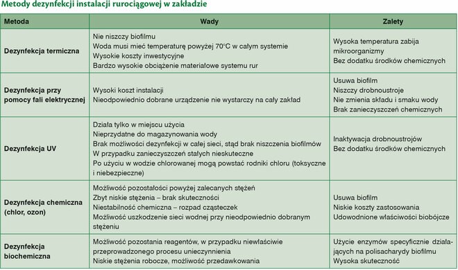 Środki czyszczące na bazie enzymów mają neutralne pH, zapewniają bezpieczeństwo personelu i chroniąc sprzęt produkcyjny przed korozją. Enzymy są w 100% naturalne i łatwo ulegają biodegradacji. Zgodnie z obecnym stanem wiedzy nie każda firma dostarczająca środki do mycia i dezynfekcji ma w swojej ofercie enzymy i wsparcie klienta w ich użyciu. Wspomnieć należy, że efektem „ubocznym” przeprowadzenia profesjonalnego usuwania biofilmów jest okresowe podniesienie się liczby drobnoustrojów w oznaczeniach, co wynika z tego, że naruszenie matriksu biofilmu powoduje czasowe uwalnianie zawartych w nim drobnoustrojów. Stan ten jest przejściowy i potem następuje przez pewien czas okres stabilnej czystości produkcyjnej wolnej od biofilmów. Zestawienie najczęściej używanych metod dezynfekcji rurociągów zakładowych przedstawiono w tabeli.