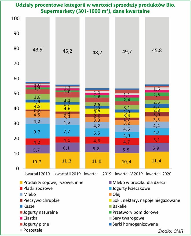 Produkty z certyfikatem bio mają znikomy udział w całkowitych obrotach sklepów małoformatowych, do 300 m2, ale ich sprzedaż stale rośnie – w 2019 r. klienci sklepów małoformatowych wydali na tego typu produkty prawie 36% więcej niż rok wcześniej. Produkty z certyfikatem bio są obecnie dostępne średnio w co trzecim sklepie małoformatowym (do 300 m2). W czwartym kwartale 2019 r. klienci mogli wybierać średnio spośród 7 tego typu produktów. Najpowszechniej dostępną kategorią produktów z certyfikatem bio są jogurty łyżeczkowe oraz jogurty naturalne. Dostępność jogurtów łyżeczkowych wzrosła na początku 2019 r., jednak od drugiego kwartału zaczęła spadać i w ostatnich miesiącach roku wyniosła ok. 1/3 sklepów małoformatowych, które mają w sprzedaży produkty bio. Ograniczenie dystrybucji jogurtów łyżeczkowych wpłynęło na ich udział w sprzedaży całej kategorii bio, w czwartym kwartale wyniósł trochę ponad 8%. Największy wzrost udziałów w wartości sprzedaży odnotowały produkty sojowe, ryżowe i inne (w tym m.in. roślinne zamienniki mleka, tofu, hummusy czy pasztety sojowe) – ich udział w wartości sprzedaży produktów bio w ostatnim kwartale 2019 r. wyniósł blisko 16%. W okresie październik- -grudzień 2019 r. pierwszą dziesiątkę rankingu najlepiej sprzedających się produktów z certyfikatem bio (wg udziałów w liczbie transakcji) zdominowały produkty z serii Bakoma Bio – jogurty oraz serek o pojemności 140 g. Na drugim i dziewiątym miejscu znalazło się Mleko Ekologiczne z OSM Piątnica oraz Napój Sojowy z Wapniem od Sante. Produkty z certyfikatem bio zazwyczaj są kupowane przy okazji większych zakupów – średnia wartość koszyka z takimi wyrobami jest ponad dwa razy wyższa niż średniego koszyka zakupowego w tym formacie sklepów. Co trzeci klient sięgający po produkty bio kupuje od razu więcej niż jedno opakowanie takiego produktu, a co drugi taki klient wydaje jednorazowo na produkty bio od 4 do 6 zł. Do koszyków z produktami z certyfikatem bio często trafiają również: mleko (pojawia się na 13% paragonów z produktami bio) i przetwory mleczne, woda czysta oraz soki i napoje niegazowane. Wśród kategorii, które na paragonach z produktami bio pojawiają się znacznie częściej niż średnio na wszystkich paragonach, znajdują się głównie produkty lekkie i zdrowe (ziarna, pieczywo chrupkie, płatki zbożowe, jogurty naturalne) oraz zdrowsze warianty przekąsek (jak chipsy owocowe czy musy owocowe). Obecność w tym zestawieniu produktów dla małych dzieci, takich jak soki, kaszki czy dania gotowe, może świadczyć o tym, że po produkty bio sięgają często młodzi rodzice. W koszykach z produktami bio aż 34 razy częściej niż na wszystkich paragonach pojawiają się również produkty sojowe, ryżowe i inne tego typu roślinne wyroby. Wśród kategorii, które na paragonach z produktami bio pojawiają się rzadziej niż ma to miejsce średnio na wszystkich paragonach, znajdują się głównie alkohole i wyroby tytoniowe, napoje gazowane i energetyzujące, a także produkty instant, takie jak zupki chińskie czy miksy kawowe.