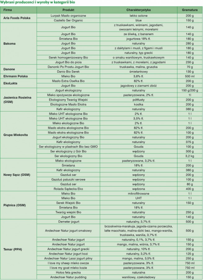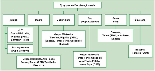 Do największych producentów markowych produktów ekologicznych można zaliczyć m.in. firmy Piątnica (OSM), Bakoma, Grupa Mlekovita. Z mniejszych polskich podmiotów warto wymienić: mleczarnie Nowy Sącz (OSM), Jasienica Rosielna (OSM), EkoŁukta, Ser-Milk Kazubscy, Gospodarstwo Jasionek, Dominik (ZPM), Ranczo Frontiera, Gospodarstwo Ekologiczne M.K. Garbaciak. Z zagranicznych producentów wspomnieć należy m.in. o firmach Arla Foods, Danone, produktach marki Soebbeke (importer Temar PPH) i Ehrmann Polska.