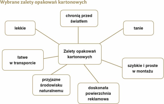 Do niewątpliwych zalet opakowań zalicza się ich cenę – są przede wszystkim stosunkowo tanim rozwiązaniem, wagę – są lekkie i nie zwiększają w sposób istotny masy produktu, co ma znaczenie w transporcie, dodatkowo są łatwe w transporcie, chronią produkty przed dostępem światła, są proste i szybkie w montażu. Ponadto stanowią bardzo dobrą powierzchnię reklamową – pozwala to na wyrobienie u klientów skojarzenia z marką i przywiązania do niej, dzięki czemu klienci chętnie wracają po produkt, który cenią, znają, lubią i rozpoznają. Kolejną zaletą jest także skalowanie rozmiarów opakowania kartonowego. Przy zastosowaniu dostępnych technologii produkcji opakowań zbiorczych klient może zaprojektować i zamówić niemal dowolny wygląd i kształt opakowania, zaś dzięki technologii kaszerowania można dodatkowo uszlachetnić opakowanie na którym szczególnie nam zależy. Kaszerowanie polega na uszlachetnieniu opakowania poprzez oklejenie go ozdobnie zadrukowaną bądź niezadrukowaną cieniutką warstwą papieru. Najczęściej kaszerowanie stosuje się w celach dekoracyjnych wobec znacznie grubszego opakowania w przypadku, gdy posiada ono na przykład bardzo grubą strukturę, która dodatkowo ma skomplikowaną wewnętrzną budowę utrudniającą zadrukowanie. Kaszerowaniem uzyskuje się także zwiększoną wytrzymałość produktu na czynniki zewnętrze oraz uzyskuje się w ten sposób zmianę struktury powierzchni.