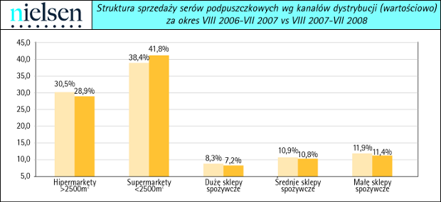 Korzystają na tym gatunki serów uznawanych za bardziej szlachetne, mianowicie sery typu szwajcarskiego. Wyniki monitoringu placówek prowadzonego przez Nielsen pokazują niezbicie, że rośnie wartość sprzedaży, przy odnotowywanym spadku wolumenu! Jeśli dodamy do tego szybki wzrost sprzedaży serów plasterkowanych oferujących dłuższą trwałość i wygodę stosowania (opcja otwórz/zamknij) to układanka rynku serowego zaczyna być spójna i logiczna w swoim sensie.