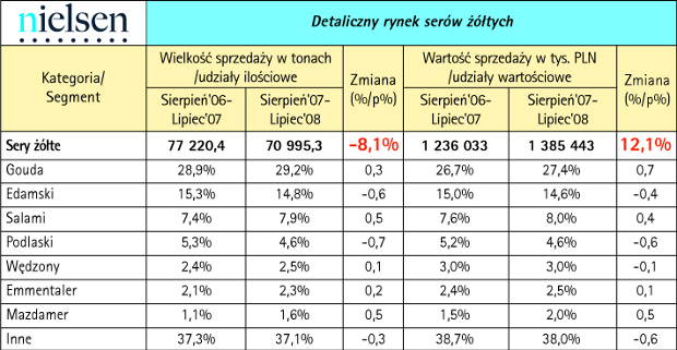 Polski rynek serów podpuszczkowych coraz wyraźniej traci cechy homogeniczności. Obserwujemy bowiem ewolucję segmentów cenowych i nisz produktowych. Segment serów do 15 zł/kg to głównie arena rywalizacji pomiędzy producentami serów typu holenderskiego w blokach. Jednocześnie ta półka cenowa nosi coraz wyraźniejsze cechy półki economy. Segment serów po 15-25 zł to w zasadzie półka średnia, gdzie znajdujemy już sery o wysokich walorach jakościowych, smakowych, a także sery innowacyjne. Tu koncentruje się sprzedaż serów plasterkowanych wszystkich typów, oraz serów typu szwajcarskiego we wszystkich postaciach. Tu znajdziemy m. in.: ementalery oraz sery z dodatkami smakowymi.