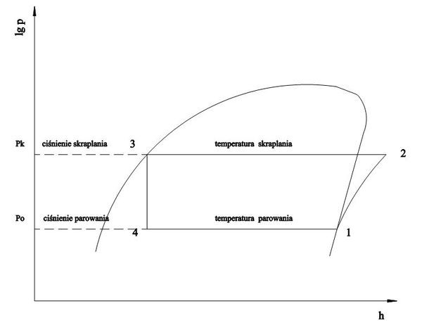 Rysunek 3. Teoretyczny obieg chłodniczy bez dochłodzenia czynnika chłodniczego
