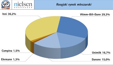 Na terenie Federacji Rosyjskiej w 2007 roku działało około 1800 producentów artykułów mlecznych. Udział rynkowy 6 największych firm stanowił blisko 60% całkowitego rynku produkcji mleka i jego przetworów. Według danych agencji badawczej Nielsen z sierpnia – września 2009 z 24 miast (dane w układzie wartościowym) największym rosyjskim producentem w sektorze mleczarskim jest obecnie Wimm-Bill-Dann (29,3%), następnie Unimilk (16,7%), Danone (15,0%), Campina, Ehrmann. Pozostałe 36,2% rynku podzieliły między siebie inne mleczarnie.