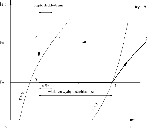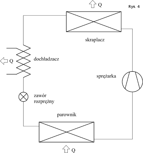 Jednym ze sposobów zmniejszenia opisanej wyżej straty energetycznej związanej z dławieniem czynnika w zaworze rozprężnym jest obniżenie jego temperatury przed zaworem. Ideowy schemat oraz wykres pokazano na rys.4 oraz rys.3. Widać tutaj, iż zastosowanie dochładzacza w układzie chłodniczym pozwala zwiększyć wydajność chłodniczą o Δqo.