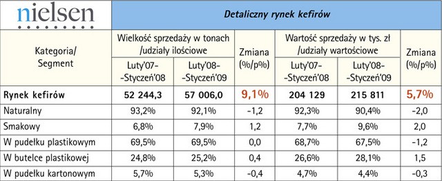 Detaliczny rynek kefirów liczy sobie około 57 tys. ton o wartości około 216 mln zł.; 92% ilościowo z tego stanowią kefiry naturalne, a 8% kefiry owocowe i warzywne. Pozycja zajmowana przez produkty smakowe wydaje się być niewarta uwagi, ale nieustannie się powiększa, co na wyraźnie rosnącym rynku (+9,1% ilościowo) daje wyraźne profity ich producentom. Do ciekawych wniosków prowadzi obserwacja zmian w strukturze sprzedaży: największa kategoria kefirów w kubkach (69,5%) z roku na rok ustępuje kefirom w butelkach (25,2%) i kefirom w kartonikach (5,3%). Poszczególni producenci oferujący głównie produkty w kubkach nie odczuwają tego zjawiska, gdyż ich sprzedaż po prostu rośnie wolniej. Jednakże ci, którzy oferują najwięcej kefirów w butelkach zwiększają sprzedaż najszybciej.
