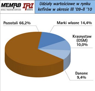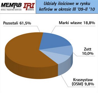 W segmencie kefirów sytuacja jest inna. Tu trzy firmy ostro rywalizują między sobą próbując podzielić między siebie rynek. Choć być może lepiej byłoby powiedzieć to w czasie przeszłym, gdyż z pojedynku między dotychczasowymi liderami, firmami Zott, Danone i Krasnystaw (OSM), najlepszą kondycję mają marki własne (14,4% wartościowo według MEMRB, 2010). Rośnie siła mleczarni Mlekpol (SM), której pozycję szacuje się na 8-9%. Wymienione cztery firmy odpowiadają za 40% rynku. W grupie mocnych średniaków plasują się Bakoma, Robico (ZUH) i Piątnica (OSM) i Kościan (OSM), pozostałą część rynku dzielą między siebie liczne rzesze małych mleczarni operujących lokalnie.