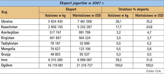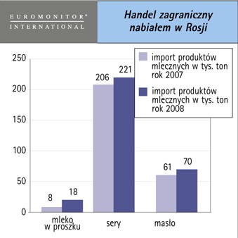 Tylko w okresie styczeń-maj 2008 roku Rosja zaimportowala masło wartości 192 mln USD (65 tys. ton podczas gdy w analogicznym okresie 2007 roku było to 58,5 tys. ton o wartości 119 mln USD. Import mleka i śmietany wyniósł 18,1 tys. ton o wartości 56 mln USD był również wyższy wobec analogicznego okresu w 2007 roku (3,411 tys. ton o wartości 14 mln USD).