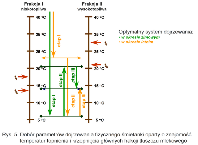 Szczególne miejsce w działaniach zmierzających do poprawy i standaryzacji reologicznych cech masła powinny być systemy oparte na znajomości, wspomnianych już wcześniej, temperatur topnienia i krzepnięcia głównych frakcji tłuszczu mlekowego. Prowadzony wg w/w zasad proces – polegający na właściwych zmianach temperatur kolejnych etapów dojrzewania fizycznego, mieszczących się między temperaturami topnienia i krzepnięcia nisko- i wysokotopliwej frakcji tłuszczu mlekowego (rys. 5) – umożliwia uzyskanie w okresie zimowym śmietanki (śmietany) bogatej w kuleczki tłuszczowe o grubych, krystalicznych powłokach i płynnym wnętrzu. Opierają się one w znacznym stopniu wysokim siłom ścinania działającym w czasie zmaślania i wygniatania, w związku z tym duża część kuleczek pozostaje nienaruszona, natomiast uwolniony płynny tłuszcz z kuleczek uszkodzonych wchodzi w skład ciągłej fazy międzyglobularnej. Uzyskane w ten sposób masło jest bardziej smarowne, a jest to związane z łatwym przemieszczaniem się stabilnych (nieuszkodzonych) kuleczek tłuszczowych na „filmie” frakcji niskotopliwych.