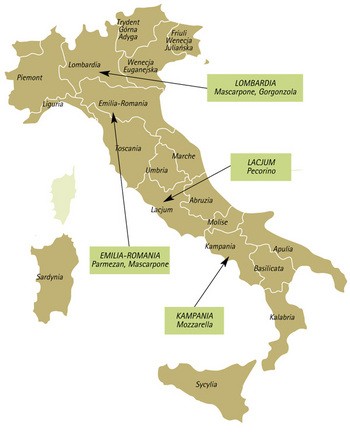 Z kolei Lacjum – region centralnych Włoch, położony nad Morzem Tyrreńskim – znane jest z sera Pecorino. Rzym słynie również ze wspaniałych deserów, takich jak np. tiramisu, co dosłownie oznacza „podnieś mnie”. Deser ten powstał w latach 60. XIX w. na bazie kawy, serka mascarpone i alkoholu: brandy lub słodkiego wina Marsala. Najlepsze mascarpone wyrabia się w Lombardii, która słynie również z produkcji słynnej gorgonzoli.