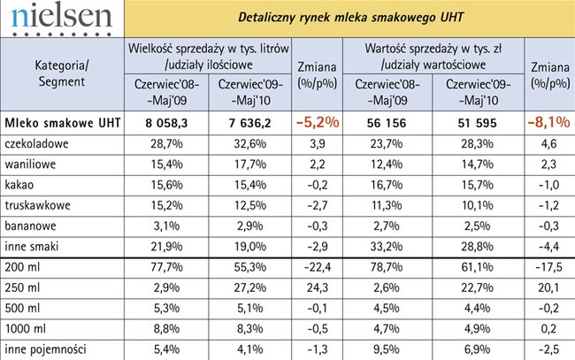 Segment mleka smakowego to obszar, który bardzo długo funkcjonował w uśpieniu. Traktowany był jako swoiste peryferia rynku zarówno przez producentów jak i handlowców. Na rynku funkcjonowało praktycznie tylko mleko Łaciate oraz mleko smakowe Trusko vita, Vani vita i Choco vita z mleczarni Mlekovita (GK). Pozostali producenci skoncentrowali się na dostawach w ramach programu Mleko w Szkole i nie naciskali na handel w celu umieszczania go na półkach. Nieprzypadkowo to uśpienie wykorzystała firma Müller, której produkt Müllermilk zaistniał już na półkach sklepowych. Co istotne dla całej sprawy, mleczarnie krajowe nie zadbały o umieszczenie produkowanych przez siebie mlek smakowych ani na półce z produktami mlecznymi dla dzieci (tam gdzie Danonki i Bakusie) ani obok na półce z mlecznymi napojami fermentowanymi. Inaczej postąpiły i Müller i drugi, nowy gracz tego segmentu (firma Lactalis Polska); swoje produkty „postawiły” nie przy mleku, ale przy jogurtach. Wart uwagi jest przy tym fakt, że obie propozycje i Müller i Lactalis Polska bazują nie na kartoniku ze słomką, ale na butelce PET. Niewątpliwie obie te firmy mają ostatnio duży wpływ na ożywienie i wzrost w kategorii. Najpopularniejsze wśród dzieci są przy tym smaki: waniliowe, truskawkowe i czekoladowe, które oferuje właśnie Lactalis Polska.