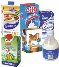 - śmietankę tłustą o zawartości 18%, stosowaną głównie do zup, sosów i deserów proponują na przykład Mlekovita (GK), Wart-Milk (OSM) z marką Mu!, Rotr (SM) z marką Delik i Raciborska (SM) w kartonach lub kubkach.