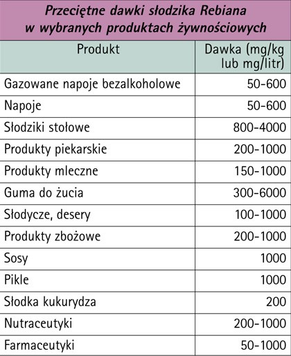Obecnie na rynku żywnościowym są oferowane cztery słodziki zawierające substancje słodzące ze stewii. Do tego celu głównie są stosowane stewiozydy i rebaudiozydy, rzadko dulcozydy. Najczęściej są mieszane z innymi słodzikami lub sacharozą, aby uniknąć posmaku gorzkiego lub lukrecjowego. Słodzik o nazwie Rebiana zawiera głównie rebaudiozyd A. Podobnie Truvia, marka handlowa produktu firm Cargill i Coca-Cola, ma w swoim składzie Rebianę i erytryt (erytritol). Pure Via, która jest marką opracowaną przez PepsiCo i Merisant, zawiera Reb-A. Enliten, produkt firmy Corn Products International, zawiera Reb A. Skład chemiczny słodzików (a co za tym idzie, również ich właściwości słodzące) może zmieniać się zależnie od składu chemicznego liści stewii użytych do produkcji oraz procesu technologicznego (głównie ekstrakcji substancji słodzących z liści i oczyszczania ekstraktów).